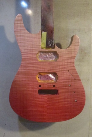 着色しました。11/16 ヘッドとポケット部分の厚みの加工をしました。11/13 ある程度グリップの形状を整えてからフレット溝の加工をしました。ボディの塗装を進めます。