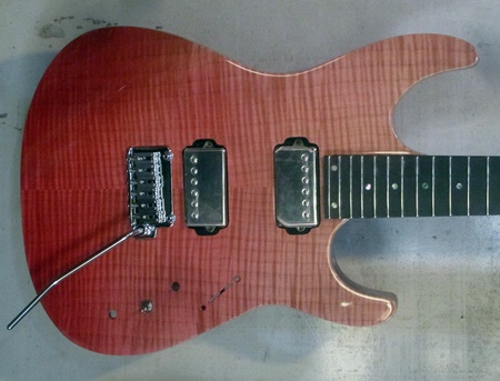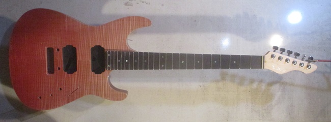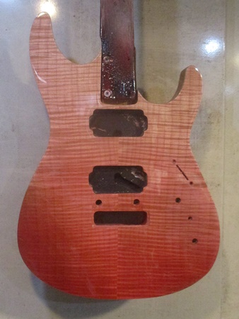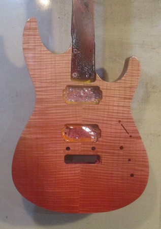 ネックが仕上がりました。1/24 サンプルを見直してグラデーションの境をブリッジ近くまでにしました。フロントPU辺りまでぼかしていく感じです。トップコートを吹き重ねています。