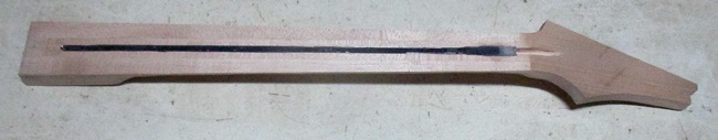 フレット溝の加工をした指板材を貼りました。8/10 ヘッドトップにツキイタを貼ってロッドを仕込みました。