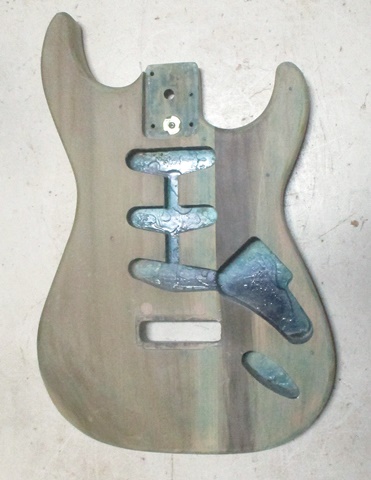 塗装とボディトップのシートを剥がしました。11/12 ネックの外周加工をしました。ボディは塗装を剥がしてボディトップのシートを剥がしています。