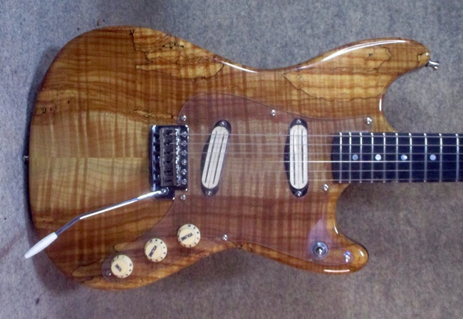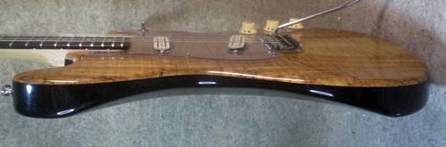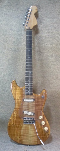 クリアーなピックガードにしてトップ材の杢が良く見えるようにしています。ピックアップはピックガードマウントでコントロールは裏からザグッて裏パネルはトップ材を切り出して制作してオイルフィニッシュにしました。塗装は下地がポリ系でラッカー仕上げになります。ピックアップはゴトーのツインレールです。デュオソニックはフロントがスラントしていますが、敢えてストラト的にフロントとリアを逆転させる感じにしています。フロントピックアップはブリッジ寄りですがピーターグリーンがゲイリームーアに譲ったレスポールのフロントに近い位置になるかと思います。