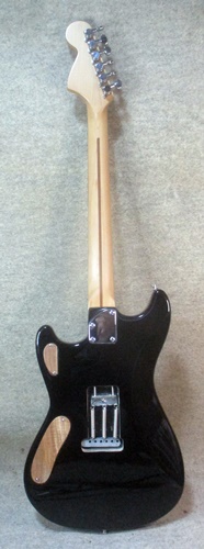 コンター加工がされた’70年代のムスタングから起こした型を元にしてデュオソニックのピックガードを合わせたボディ外周です。この頃のフェンダー製のギターは磨きによる個体差が少なくない事に加えてリフィニッシュだった記憶がありますので、少し癖がある形状だと思います。それに合わせたピックガードは某社のサンプルを実寸にしたものを利用しています。ですので概ねデュオソニックの外周に近いと思われますが、ボディエンドの形状はムスタング的です。ムスタングを基本として起こした形状のボディにミディアムスケールネックを組み合わせておりますのでサイクロンのでデュオソニックシェイプのイメージのモデルです。