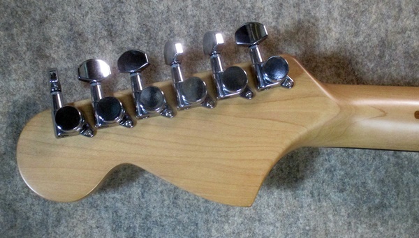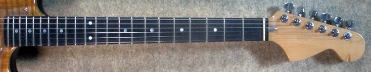 | 初期に制作したザウルスヘッドのロケットナットエボニー指板22F仕様ネックに交換しました。 |