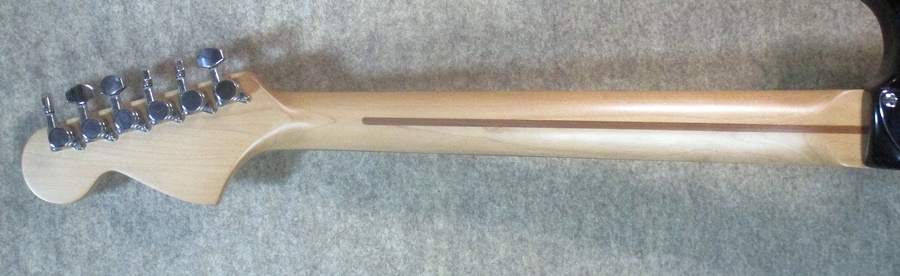 工房の初期のネックを仕上げたもので、現在は受注していない1Pネックの仕込みでバレットナット仕様です。ラージタイプのザウルスヘッドなので’70のフェンダー風に見えます。ペグはMusiclily製のロックのシャーラータイプを取り付けました。シャフトにトラブルがある場合がありますが、こちらは問題無く弦をロック可能です。指板は希少になりつつあるエボニーでヒサシ付きの22フレットです。20年以上前に入荷したものなので近年ではほぼ手に入れる事のできない殆どムラも無く黒い材になります。ポジションマークは6パイのパールドットです。