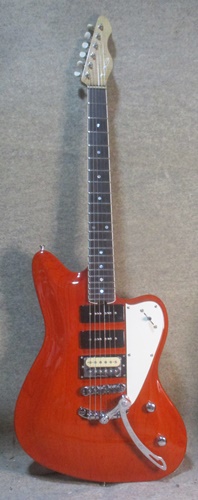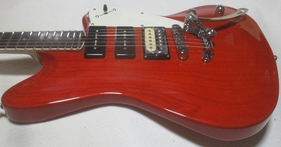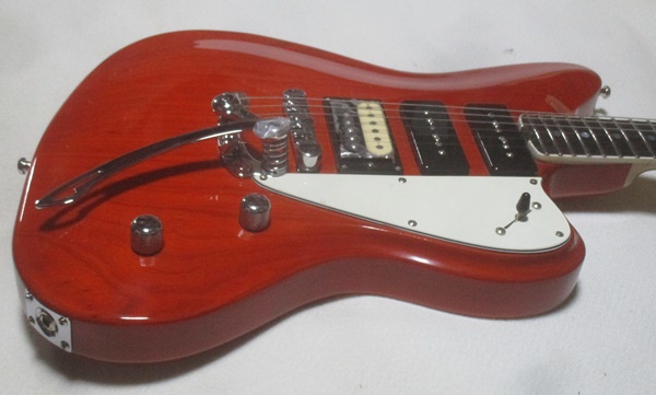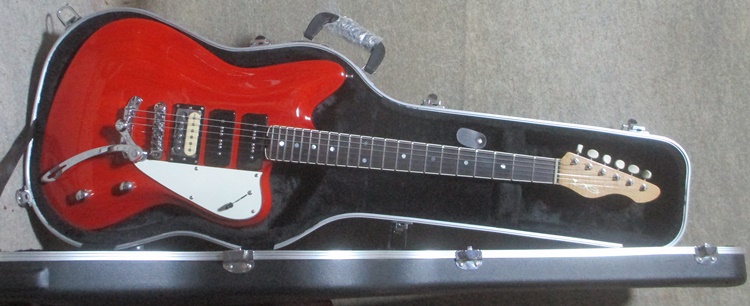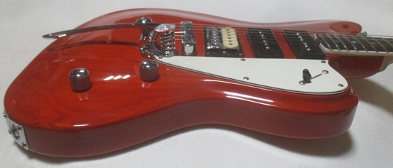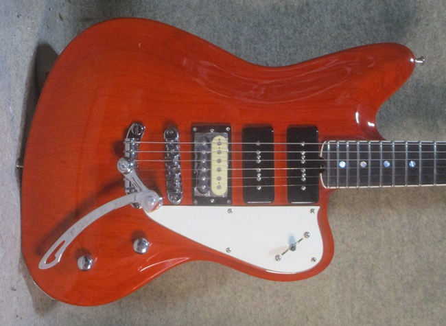フェンダーにはジャズマスターとほぼ同形でショートスケールのジャガーがありますが、ボディが少し大きい事や形状もジャズマスターの方が好みだったこともあって、ロングスケールのジャズマスターのボディをショートスケールの比率で縮小してショートスケールのネックを組み合わせました。ジャズマスターやジャガーはボディサイズが大き目ですが、ボディサイズを縮小したことでストラトキャスター等の汎用ケースに収納する事が出来ます。それをモズライトの様なカーブドトップにしてファイヤーバード風?のピックガードを取り付けました。